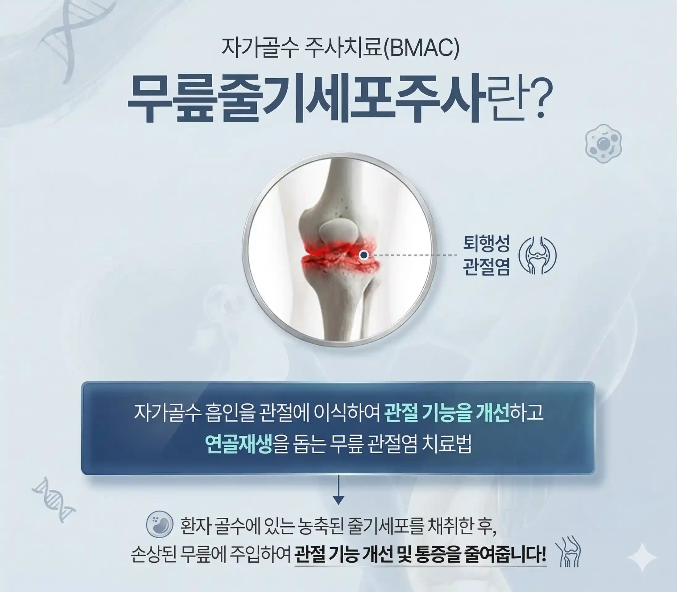 계단 오르내리기가 두려워지는 40대 후반부터 60대까지, 무릎 통증으로 정형외과를 찾으면 “연골이 닳았으니 본인의 골수를 뽑아 농축한 뒤 무릎에 넣는 줄기세포 주사(BMAC)를 맞아보자”는 권유를 흔하게 받게 됩니다.
