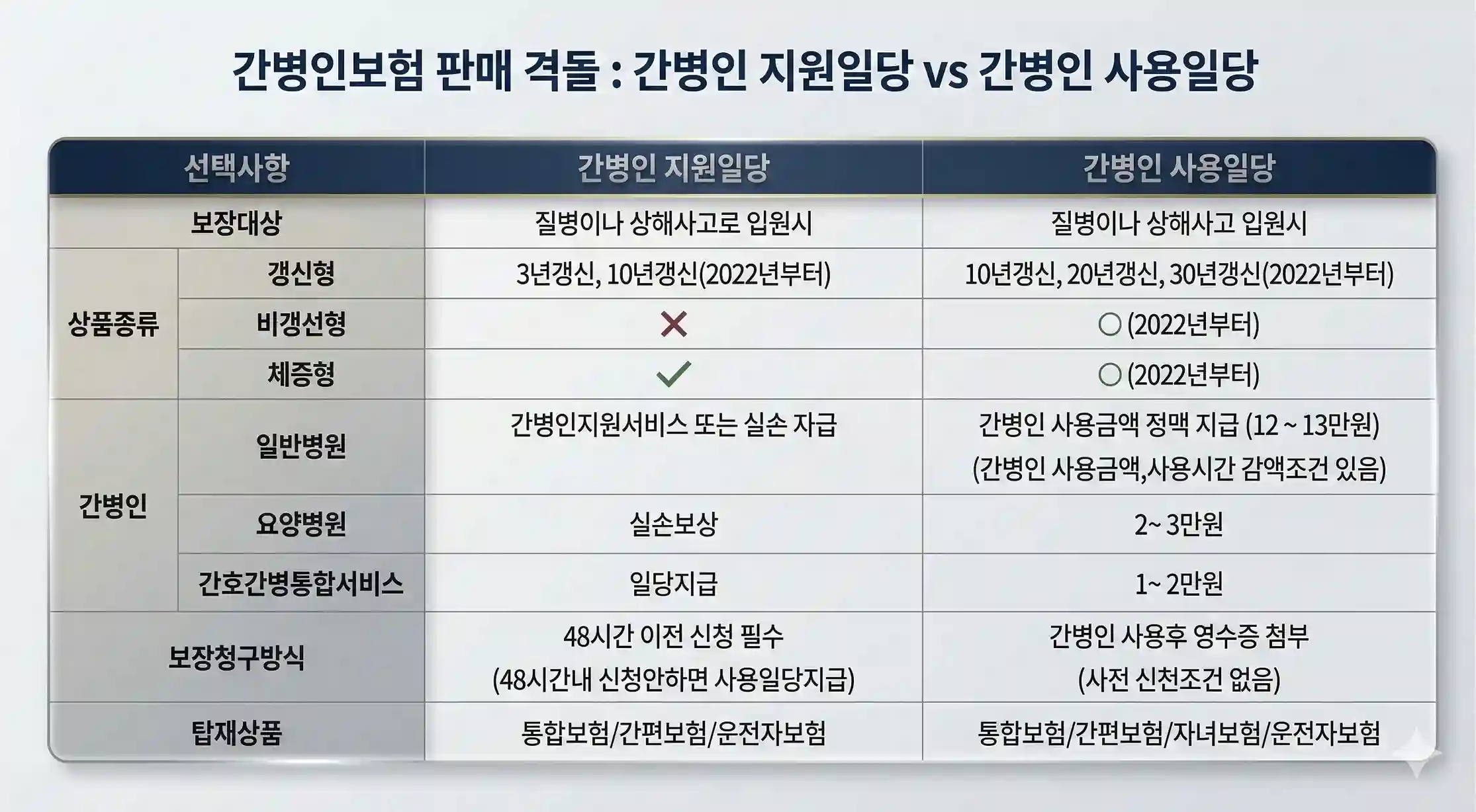 | 간병인 선택권 | 보험사 제휴업체 배정 (마음에 안 들어도 교체 번거로움) | 내가 직접 원하는 사람 선택 가능 (가족 간병 가능 상품도 있음) |