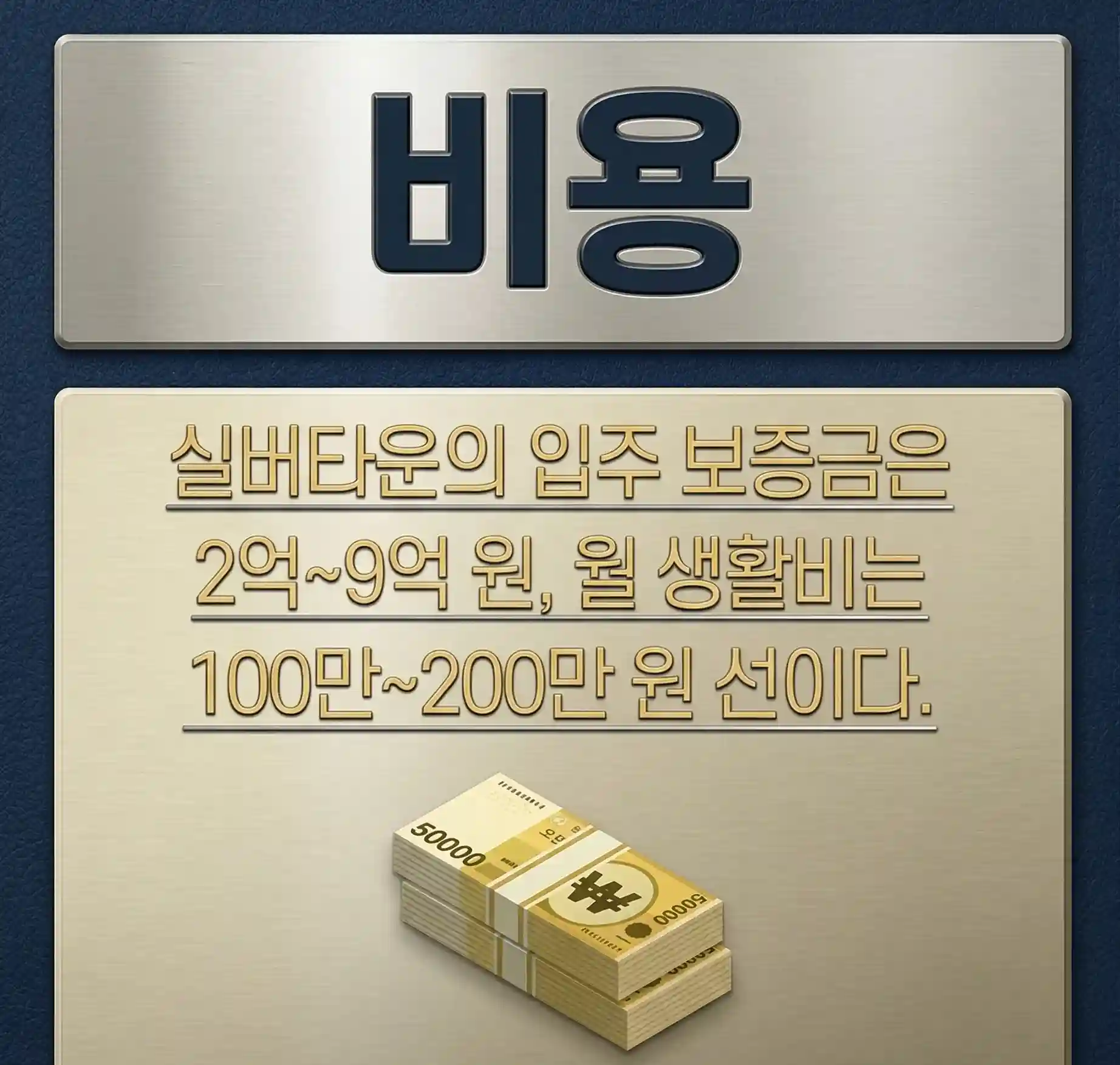 - 근교형 (중급/수도권): 입주 보증금 2억 원 ~ 4억 원 / 월 생활비 월 150만 원 ~ 250만 원